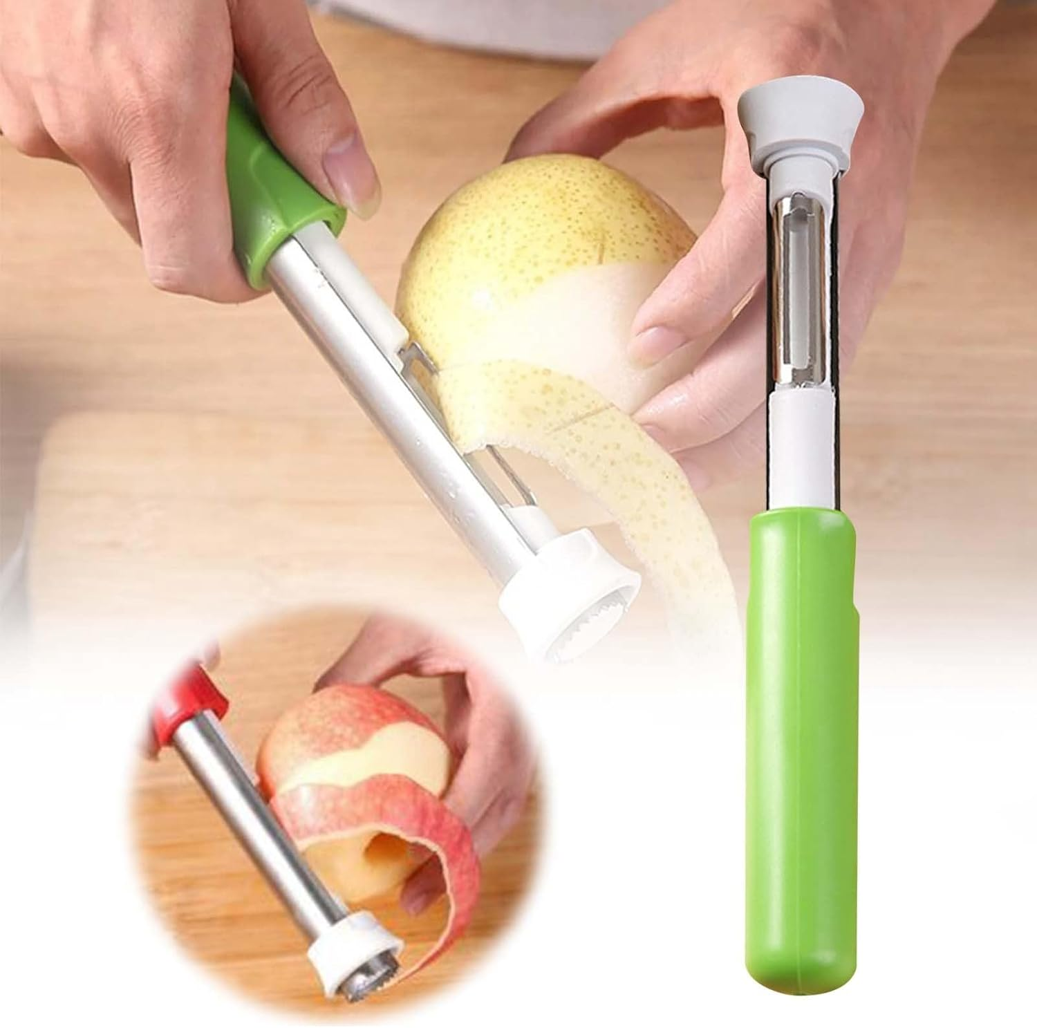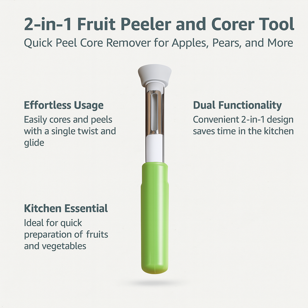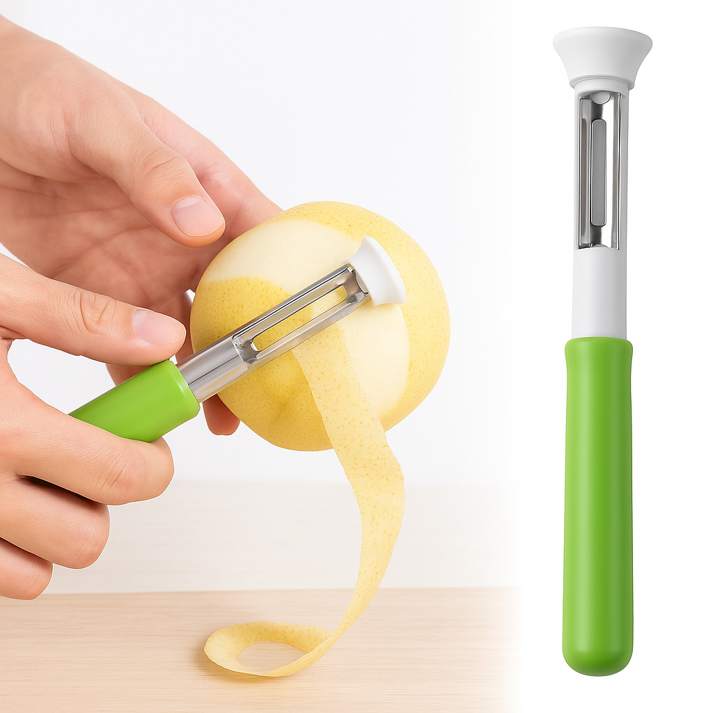 Fie că pregătești un desert rapid sau vrei să savurezi un fruct perfect curățat, CorePeel Duo™ este ustensila de care ai nevoie. Acest dispozitiv 2-în-1 îmbină funcția de peeler (curățător) cu cea de corer (îndepărtare a sâmburilor), economisind timp și spațiu în bucătărie. Lama ascuțită din oțel inoxidabil și capătul special pentru scos cotorul fac procesul extrem de ușor și eficient.