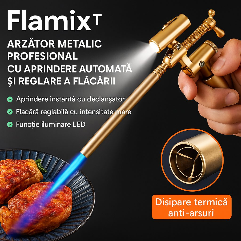 Flamix™ este un arzător metalic premium, cu aprindere automată și reglare fină a intensității flăcării. Construit pentru bucătari, pasionați de gastronomie sau meșteri care au nevoie de flacără concentrată, acest instrument combină siguranța, puterea și funcționalitatea într-un singur dispozitiv.