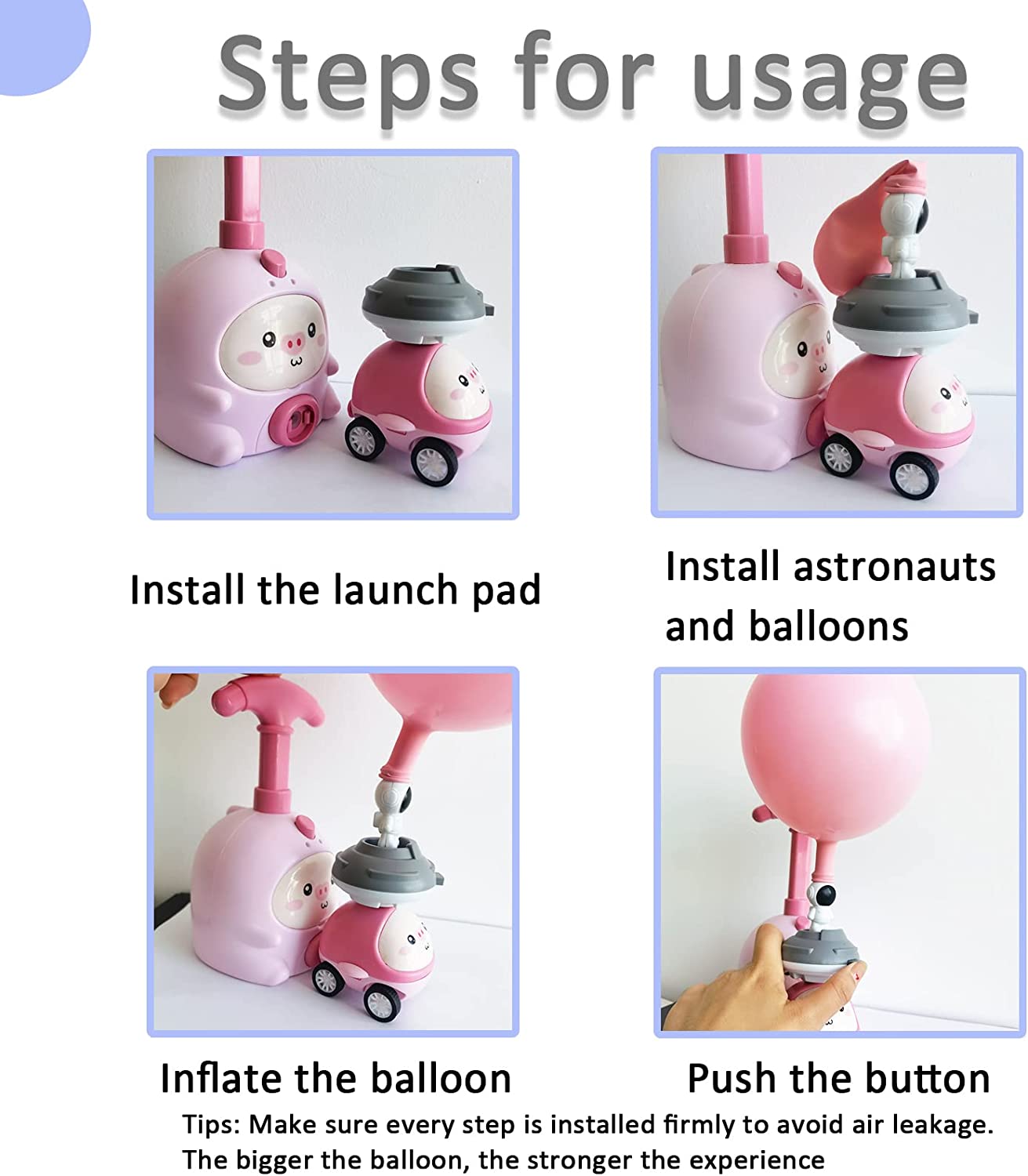- Dimensiunea produsului: umflator 21 x 12 cm, mașină cu balon 8 x 6 cm, conector 6 x 4 cm, spaceman 5 x 3 cm