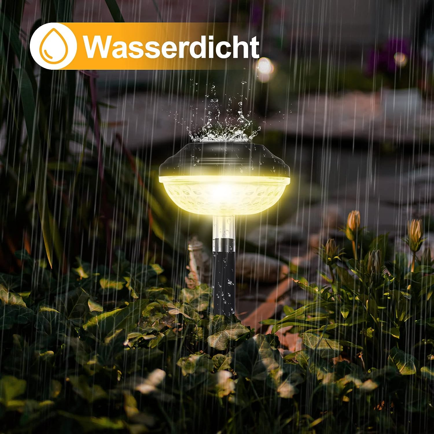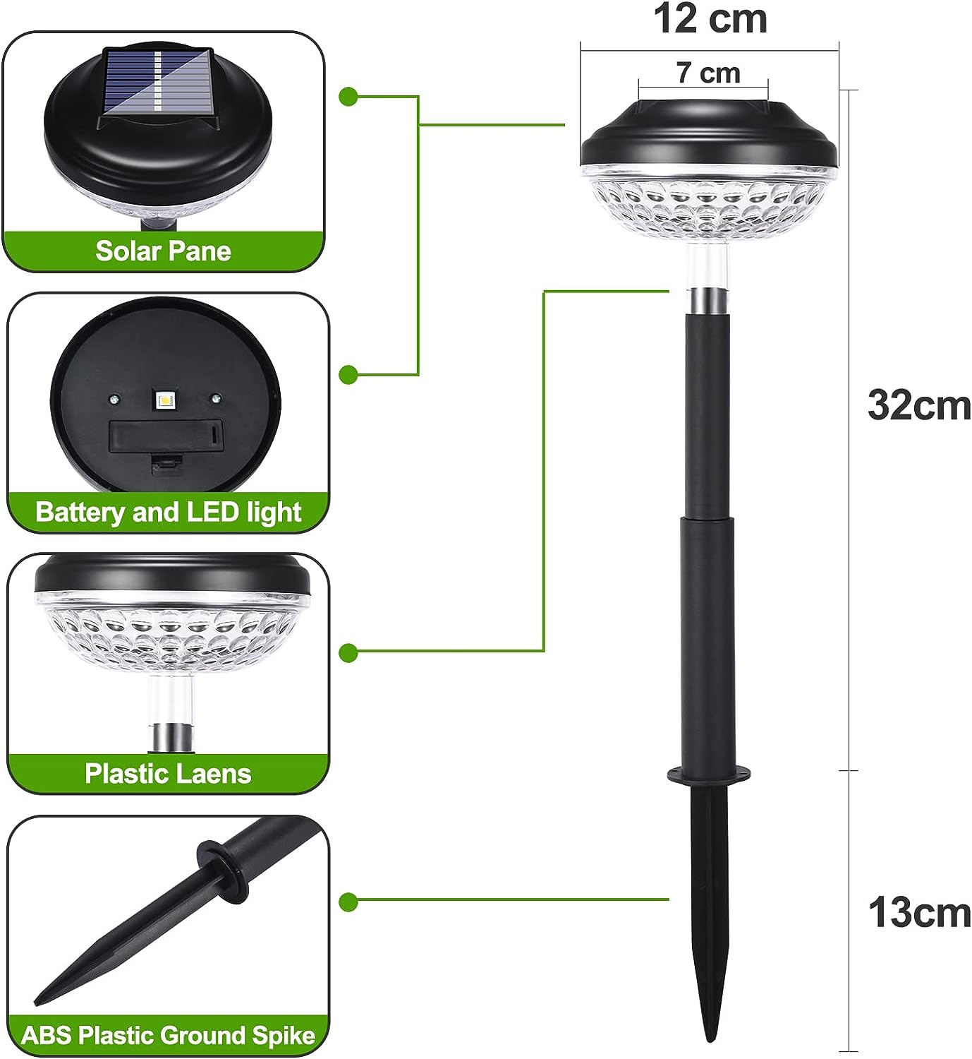 【2 moduri de lumină și lumină până la 13 ore】Lămpile solare pentru cale are 2 moduri de lumină (multicolor și alb cald), în comparație cu luminile de exterior alimentate cu energie solară cu o singură culoare, luminile noastre solare de sol au multe opțiuni plăcute din punct de vedere estetic. Luminile solare pentru căile de curte au o baterie încorporată de 800 mAh, care poate stoca mai multă energie solară, poate fi iluminată continuu timp de 10-13 ore după încărcare timp de 6-8 ore la soare și are o durată de viață lungă, nu trebuie să vă faceți griji despre scăderea luminozității sau oprirea funcționării.