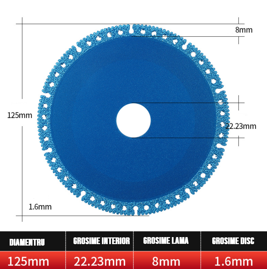 • Model potrivit: potrivit pentru utilizare cu polizoare unghiulare de tip 125 și mașini de tăiat pietre. Este ușor de instalat și utilizat și poate rezista cerințelor tăierii uscate și tăierilor lungi și continue.