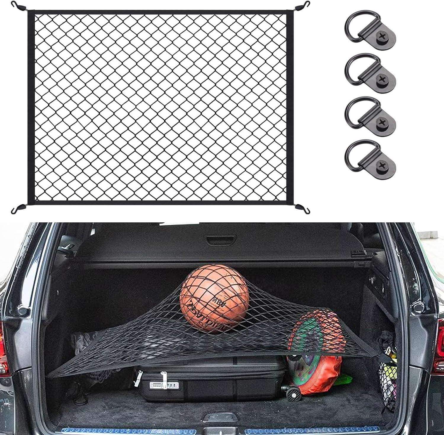 🚘 Instalare Ușoară - Pachetul cu plasa elastică de încărcare zxbaers include uneltele necesare pentru instalare - 4 cârlige și 4 seturi de kituri de montare. Folosește-le pentru a finaliza rapid instalarea, fără a avea nevoie de accesorii suplimentare.