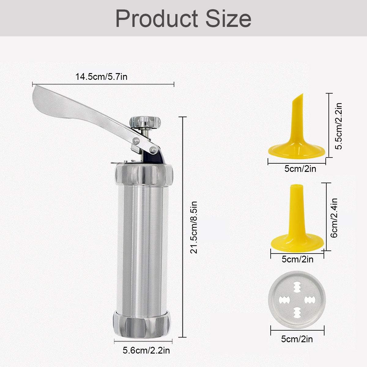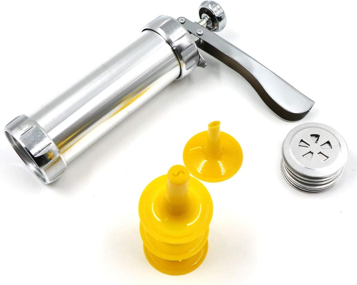 - Material de înaltă calitate: presa pentru prăjituri este fabricată din oțel inoxidabil, care este rezistent la coroziune și durabil. Duza este realizata din plastic ABS cu rezistenta mare la impact. Acesta este cel mai bun instrument de bucătărie pentru presă de prăjituri și forme de desert.