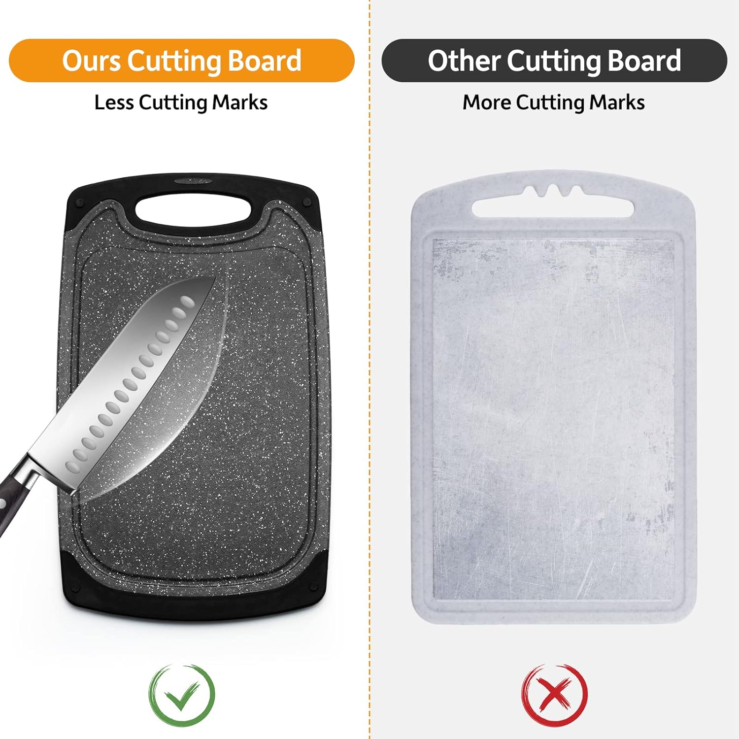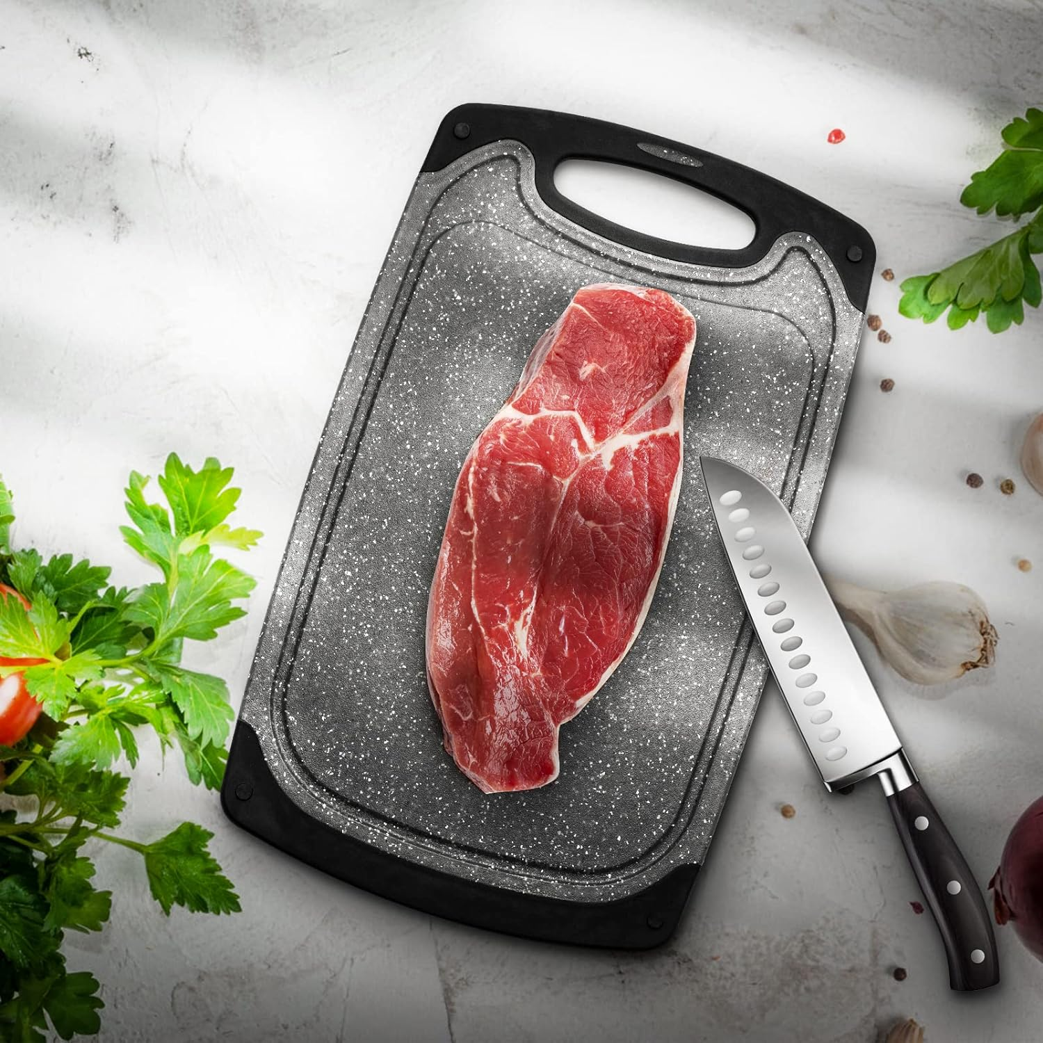 Materiale de Înaltă Calitate: Tava de tăiat este fabricată din PP, care protejează cuțitul și reduce urmele acestuia pe tava de tăiat pentru o durată de viață lungă. Tava de tăiat are o grosime mai mare și nu se deformează sau sfărâmă, facilitând tăierea cărnii și legumelor. Orificiile laterale ale mânerului de tăiat fixează ouăle sau alte obiecte instabile pentru a nu se mișca.