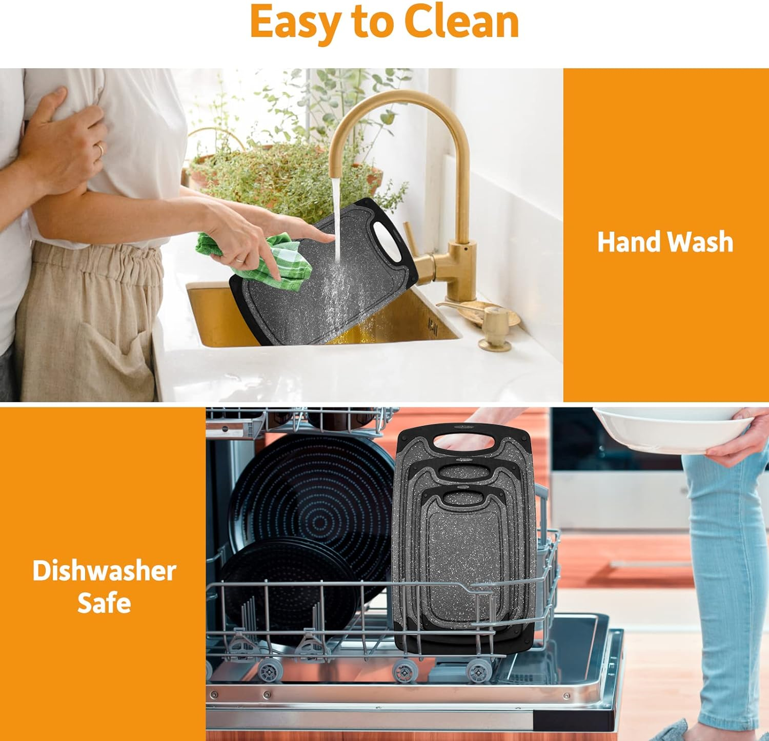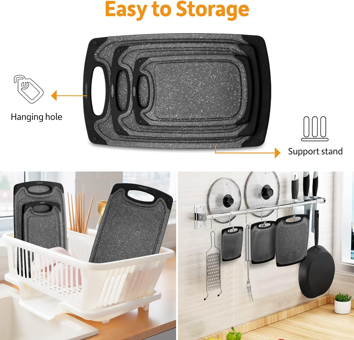 Ușor de Curățat și Economisește Spațiu: Pur și simplu clătește suprafața cu apă pentru a arăta ca nouă. Tavile de tăiat se pot spăla în mașina de spălat vase. Nu trebuie să-ți faci griji pentru așchii, crăpături sau decojiri chiar și după multe spălări. Mânerul antiderapant face ca tava de tăiat să fie ușor de prins și de agățat pe cârligele din bucătărie. Ușoară și compactă, ușor de depozitat.