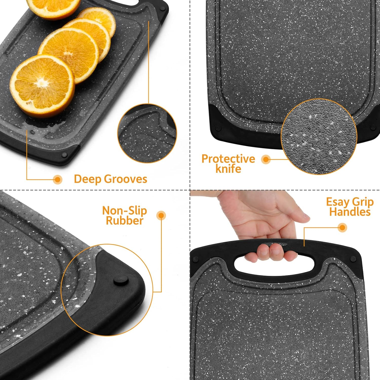 Design Avansat: Cu un canal pentru sucuri situat în jurul tăvii de tăiat, sucurile sau lichidele produse în timpul tăierii alimentelor se vor colecta în acesta, astfel încât să nu se verse pe blatul bucătăriei tale. Cu covorașe de cauciuc antiderapante integrate în fiecare tavă de tăiat, tava nu se va mișca sau aluneca, permițând o tăiere mai netedă și mai sigură.
