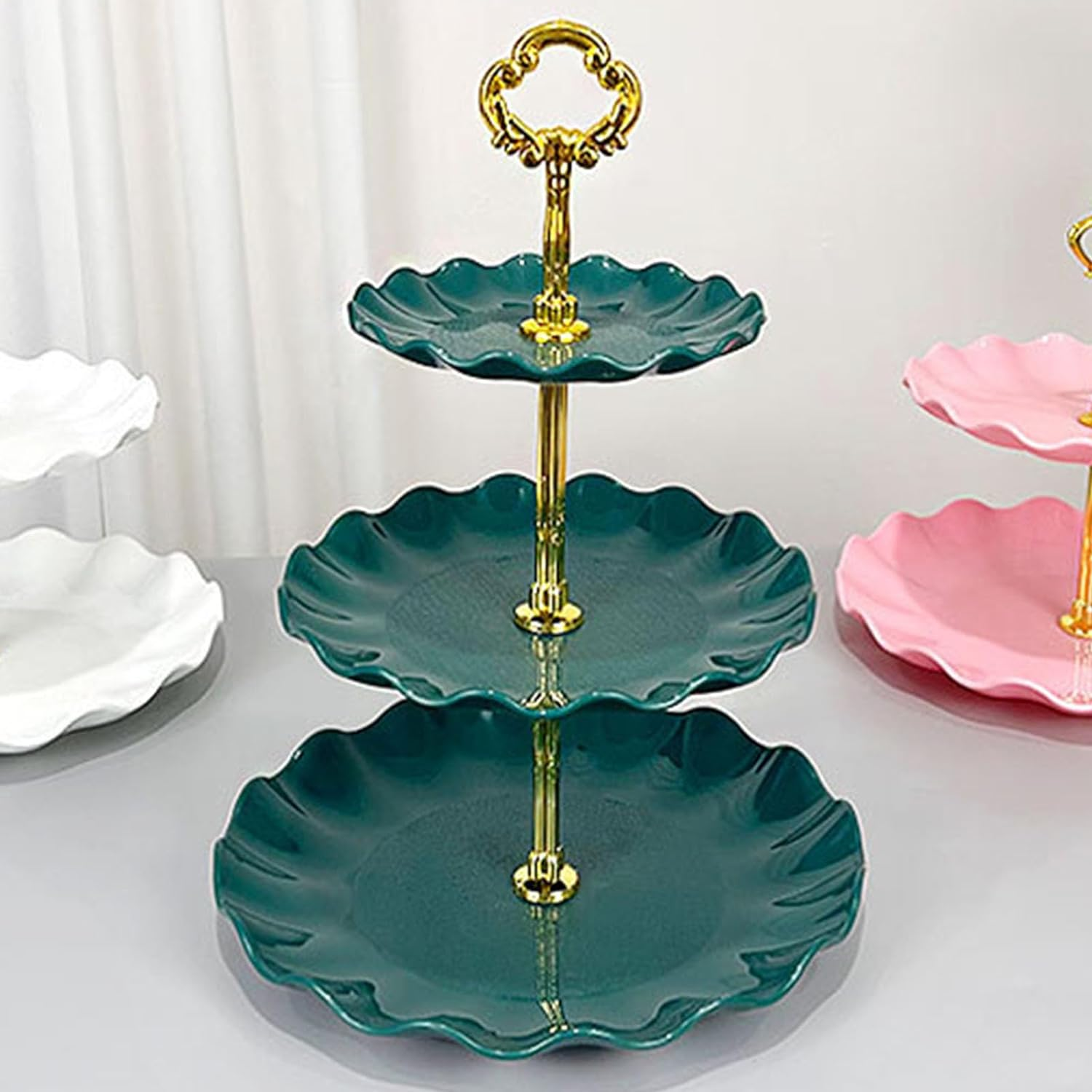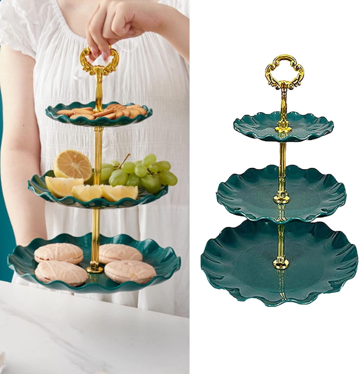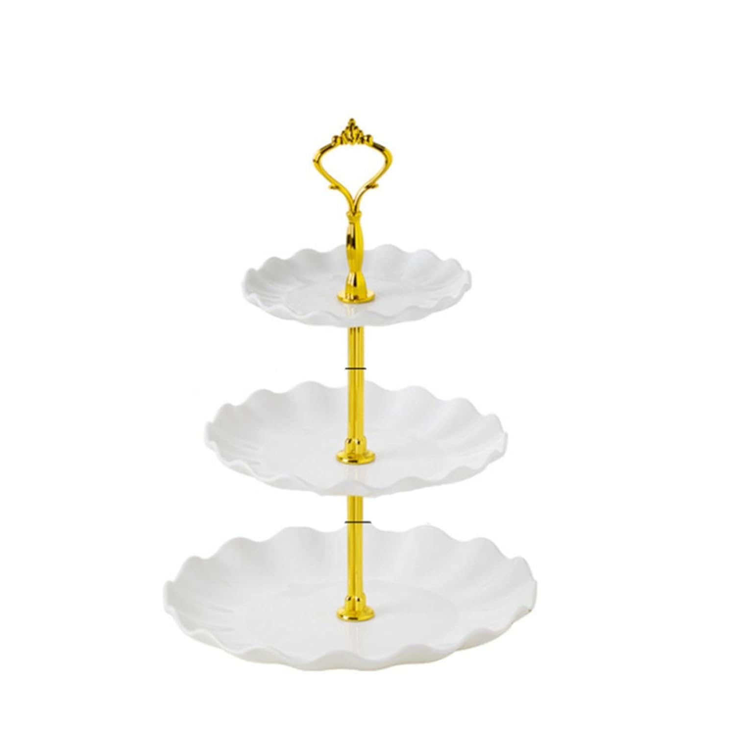 Spațiu Generos pe 3 Niveluri: Dispunând de un design cu trei etaje, acest stand oferă un spațiu amplu pentru a prezenta o varietate de delicii. Fiecare nivel poate fi umplut cu prăjituri, gustări, fructe sau orice altceva doriți. Nivelurile sunt conectate prin stâlpi solizi și șuruburi pentru o stabilitate sporită.
