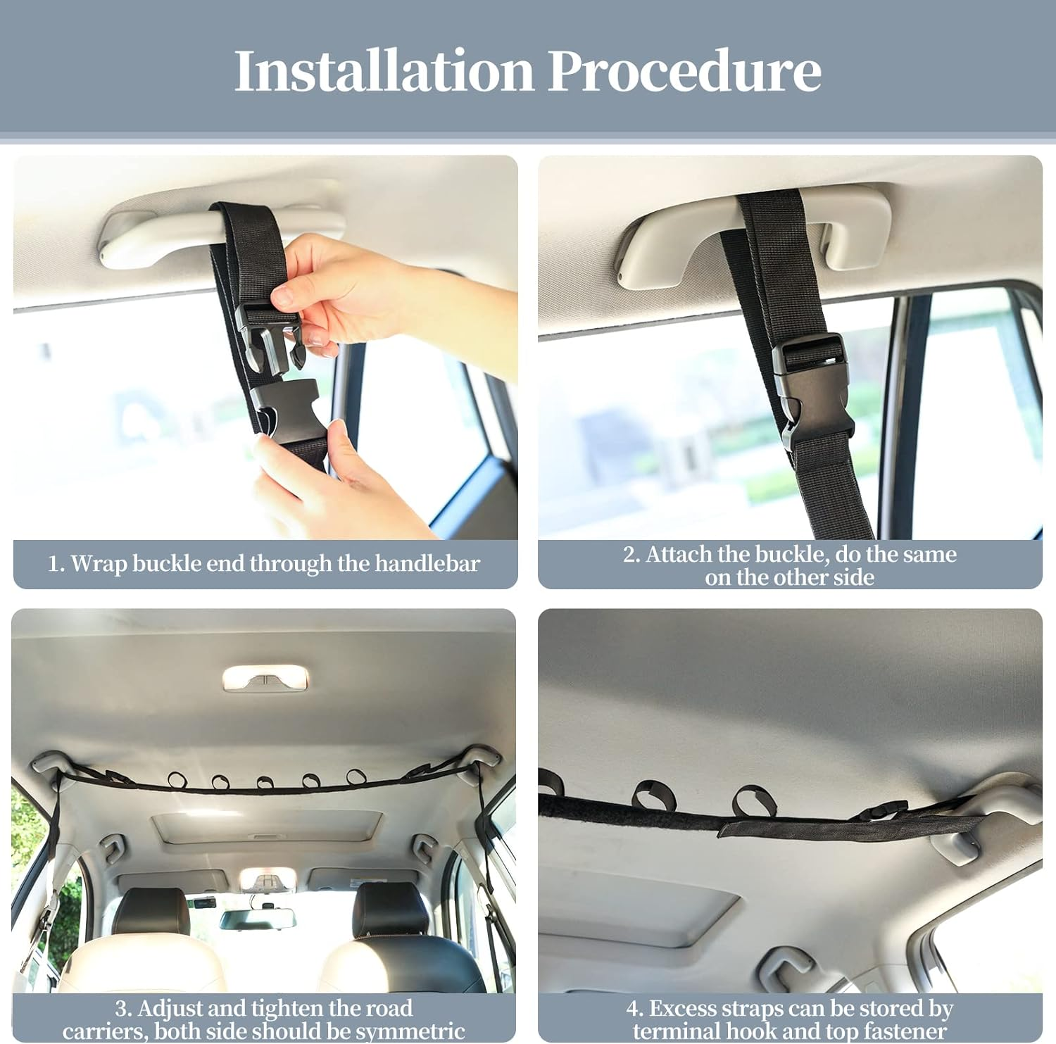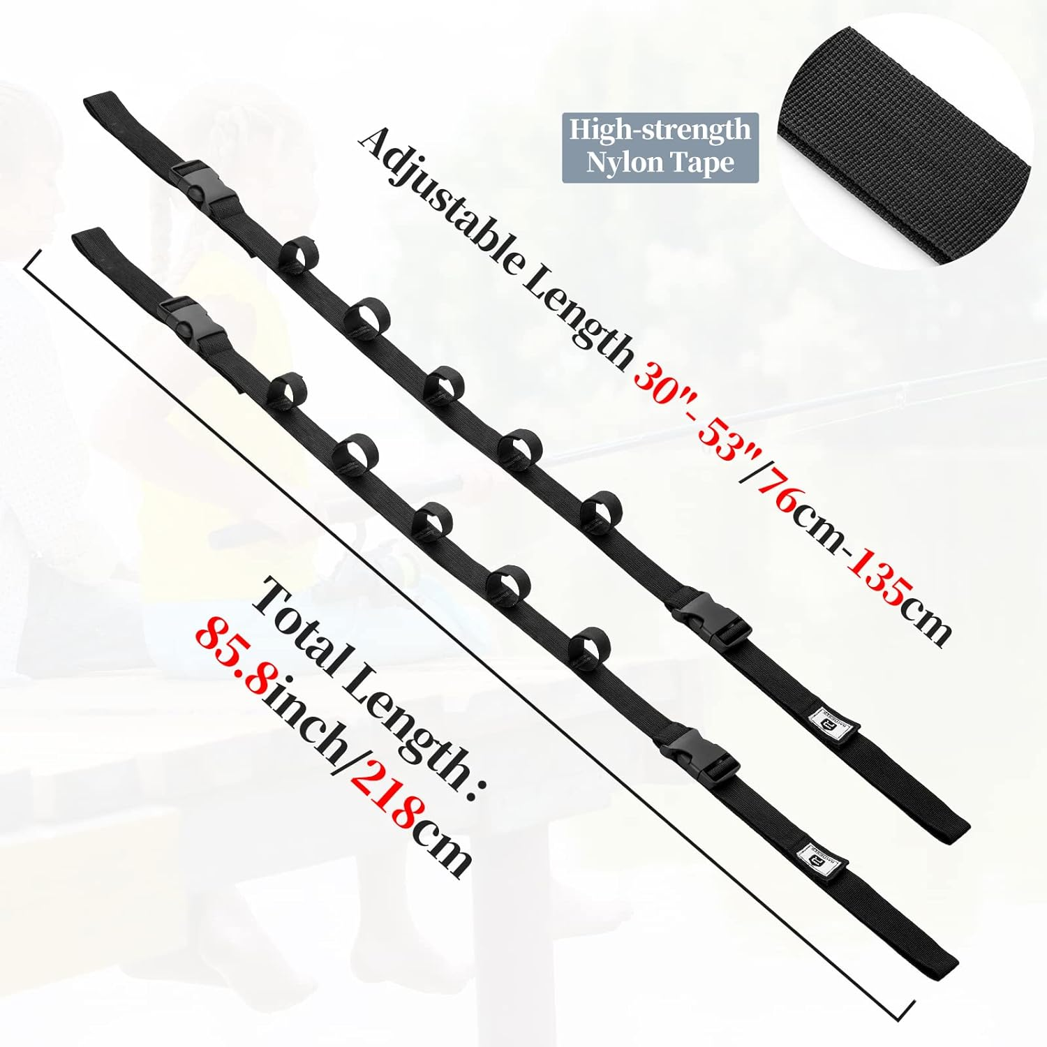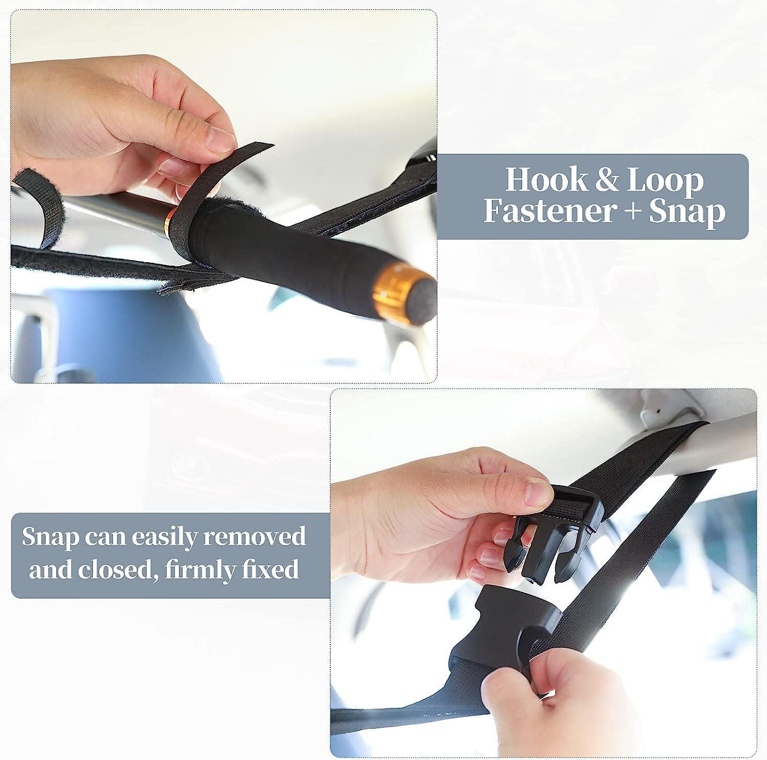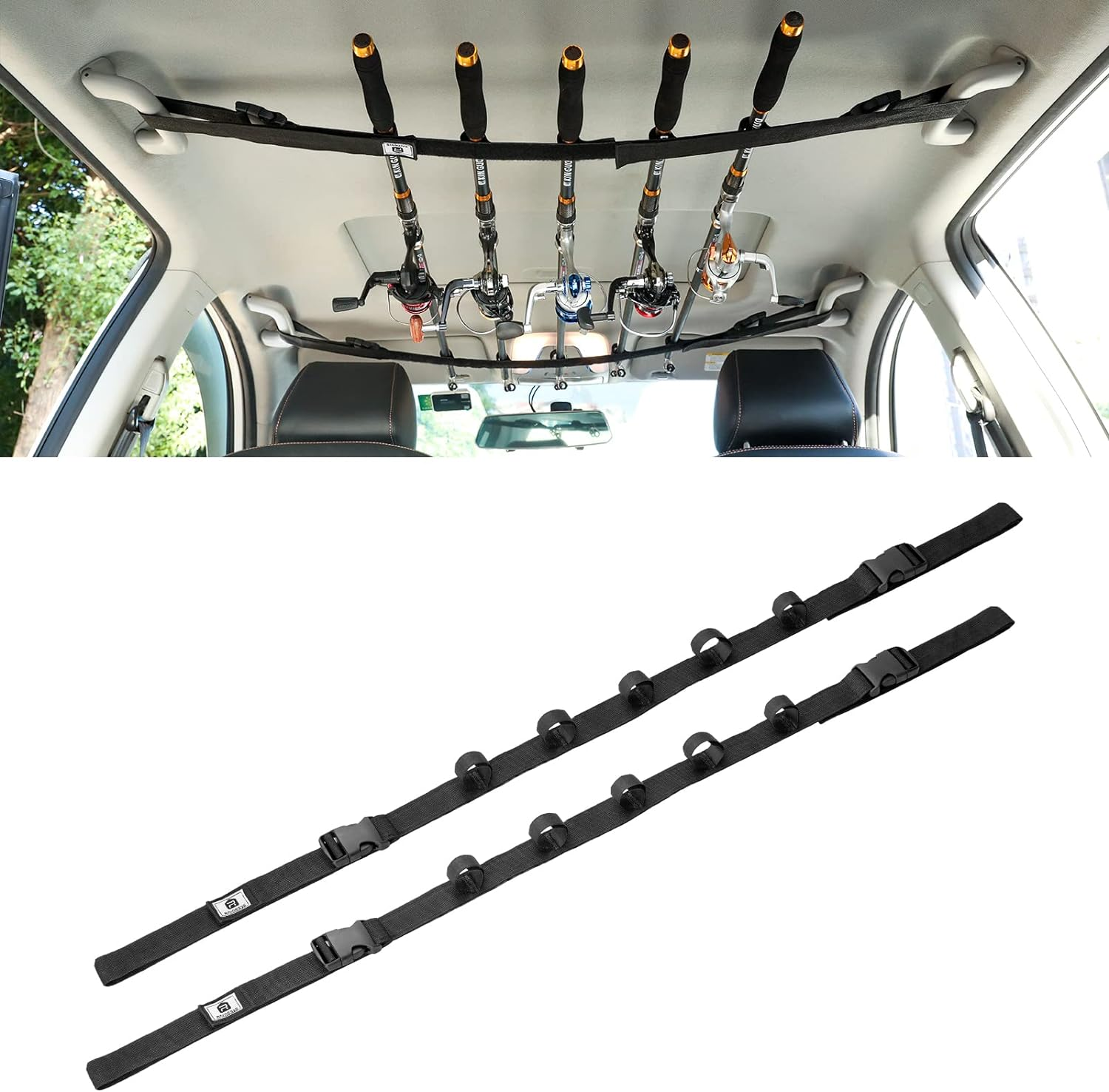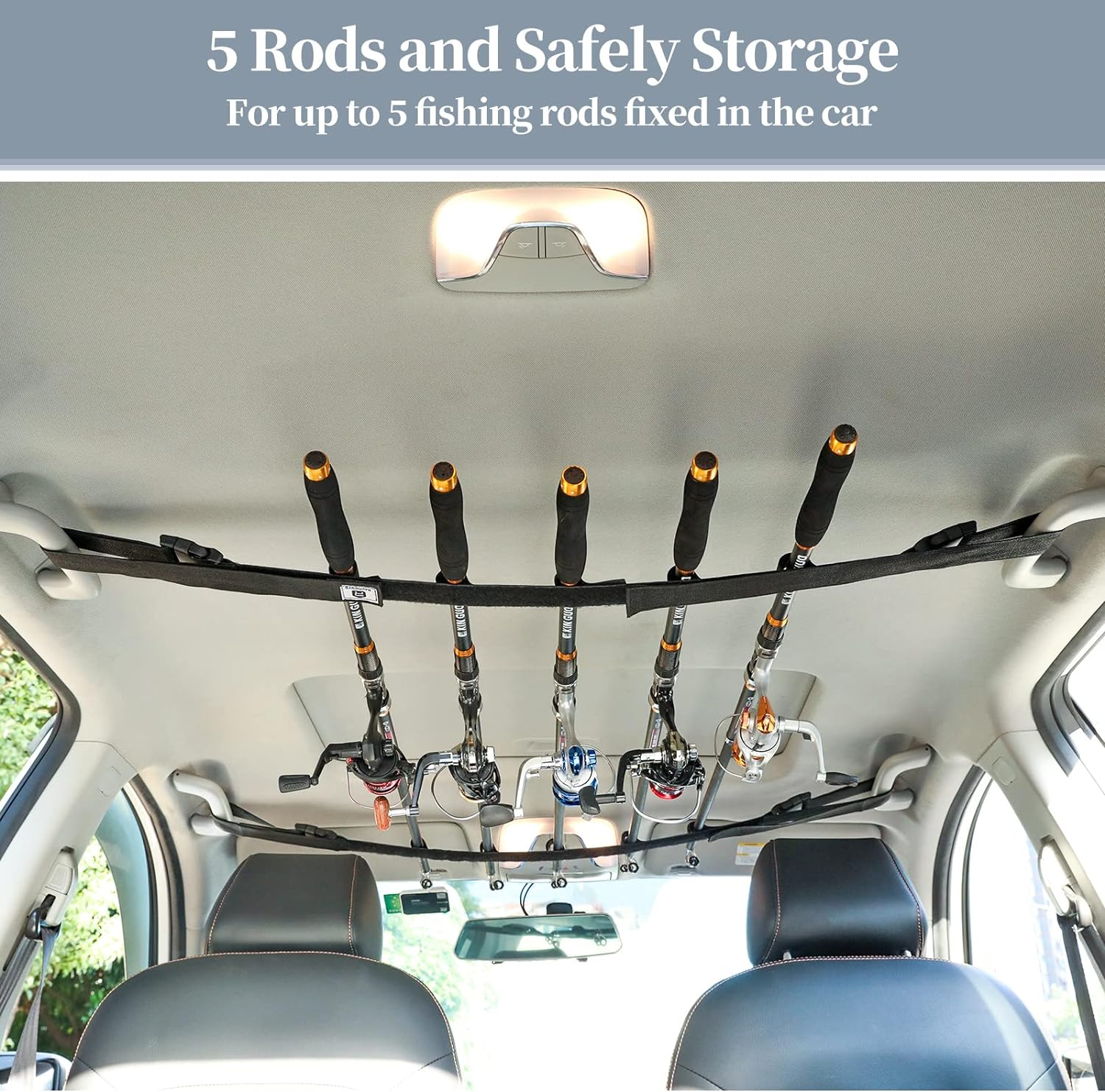- Curele reglabile pentru undițe: Suportul pentru undițe are o lungime totală de 85,8 inci, ajustabil de la 30" la 53" (76 cm - 135 cm), fiind potrivit pentru majoritatea camionetelor și mașinilor cu patru mânere, putând susține până la 5 undițe.