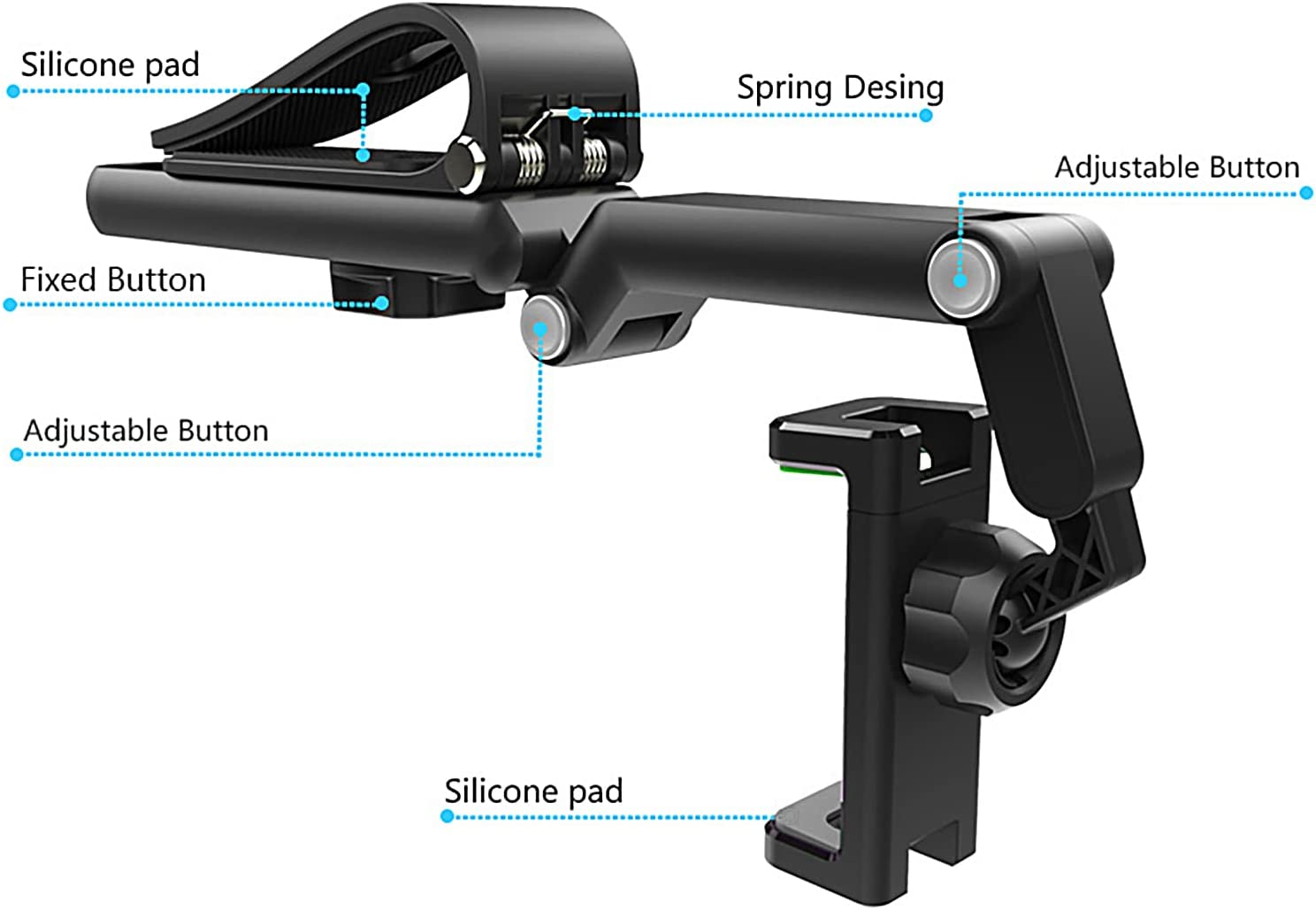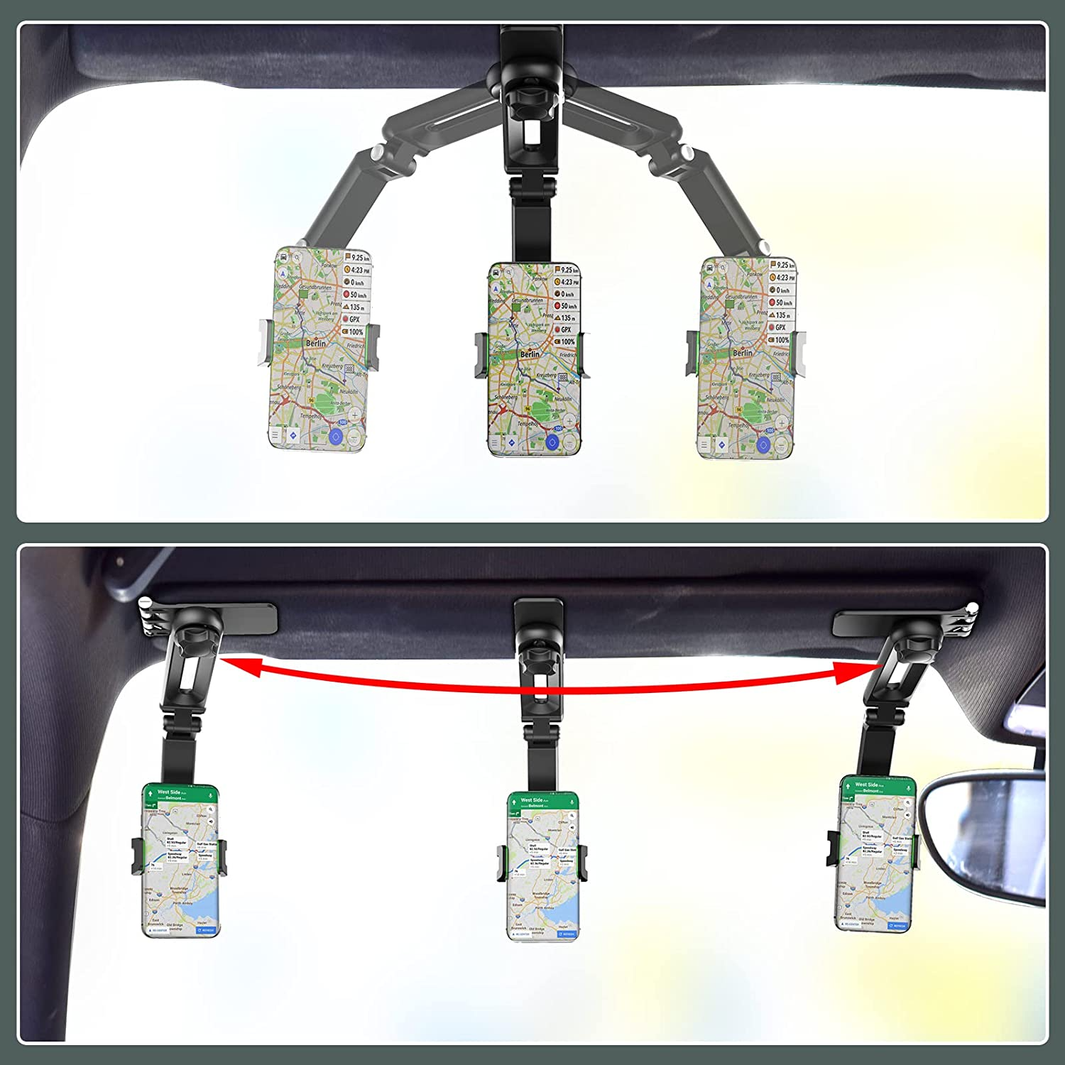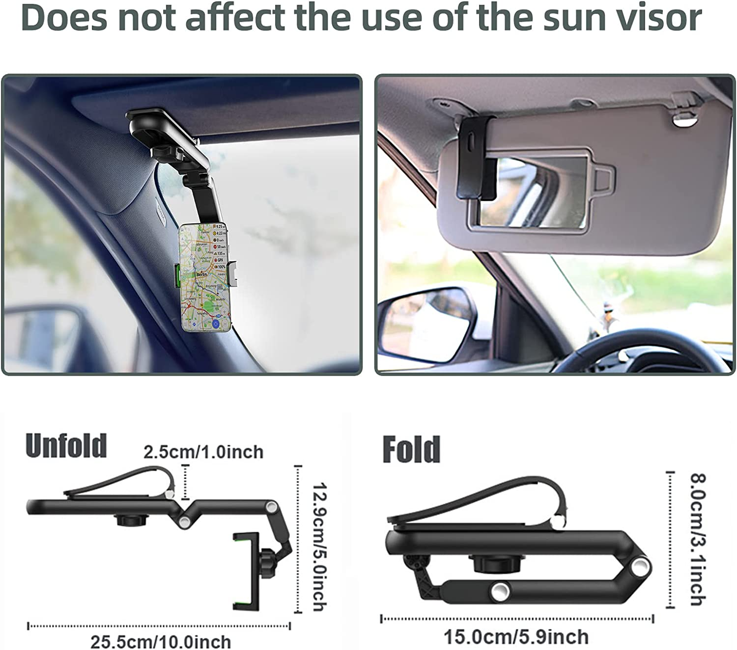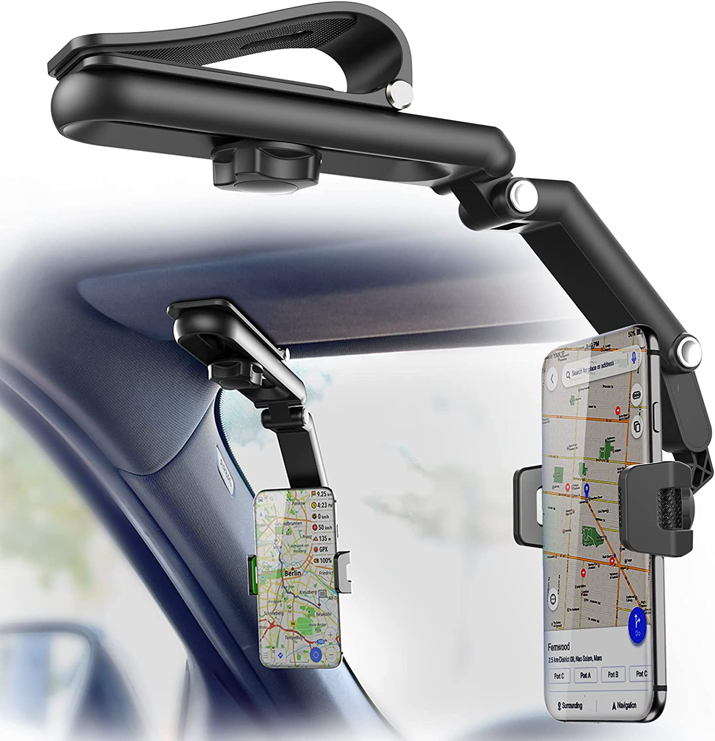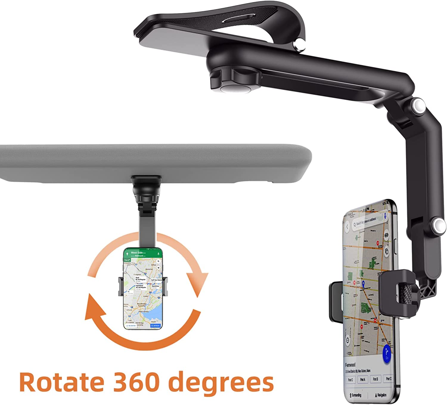 【Braț telescopic reglabil】Pivotă în sus și în jos la 360 de grade pentru cele mai favorabile poziții, indiferent dacă este montat fie pe parasolar, fie pe oglinda retrovizoare; Telefonul poate fi rotit în orientări peisaj și portret; Împiedicați blocarea vederii în timp ce conduceți.