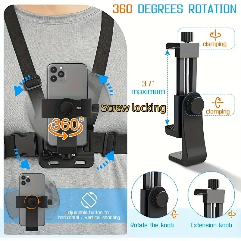 - 【Alegerea Excelentă pentru POV/VLOG】Telefonul poate fi plasat atât orizontal, cât și vertical. Designul cu cârlig J și șurub lung poate face telefonul să se rotească cu 90°. Dimensiunea acestei curele este ușor ajustabilă, se potrivește chiar și celor mai mari jachete de iarnă, adaptându-se la o gamă largă de dimensiuni corporale.