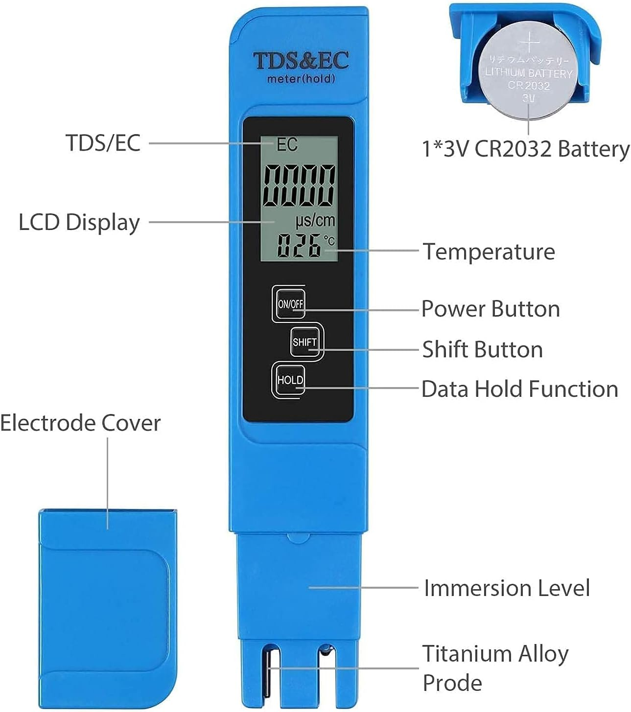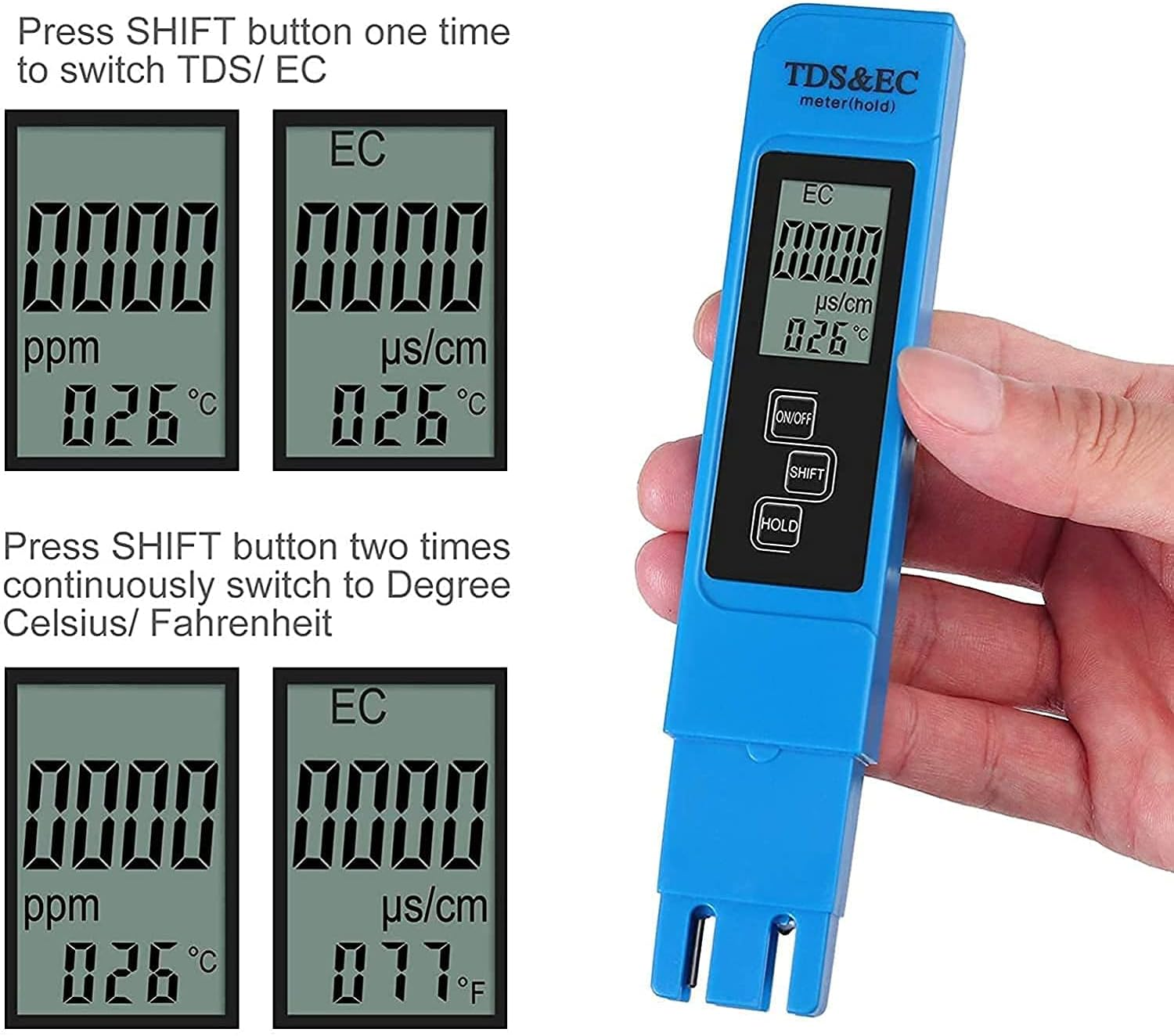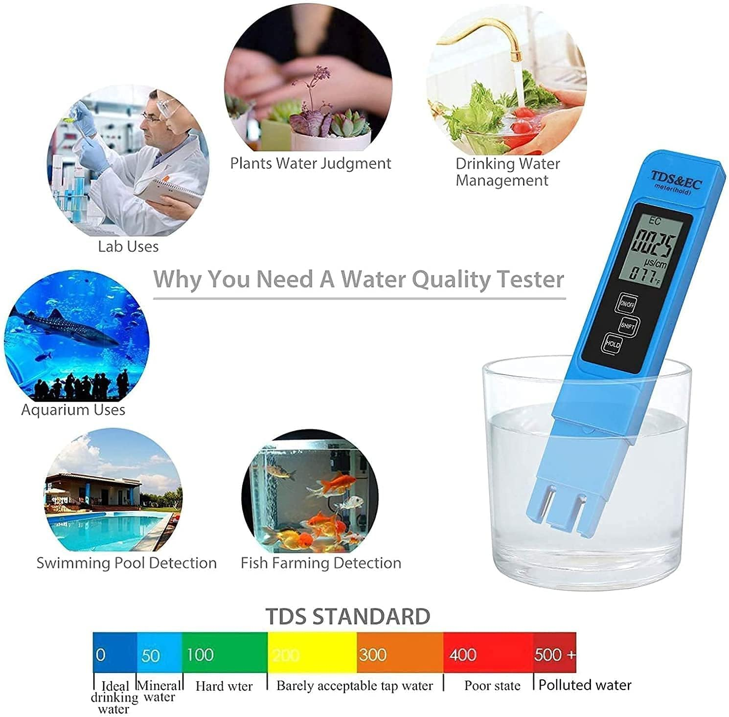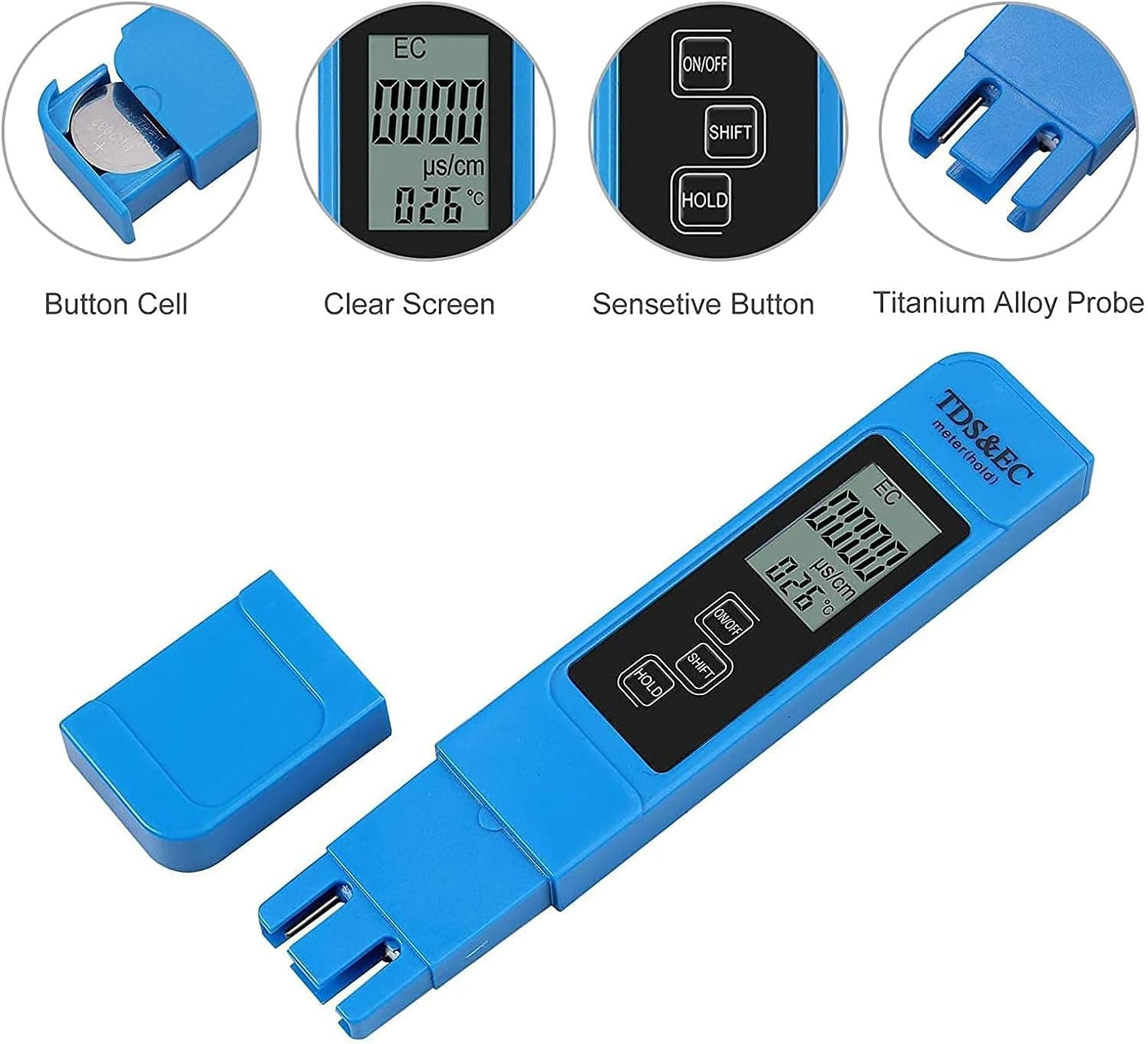 Măsurători 3 în 1: Testerul oferă măsurători precise pentru TDS, EC și temperatura apei, asigurând o evaluare completă a calității acesteia. Totul într-un singur dispozitiv compact și ușor de utilizat.
