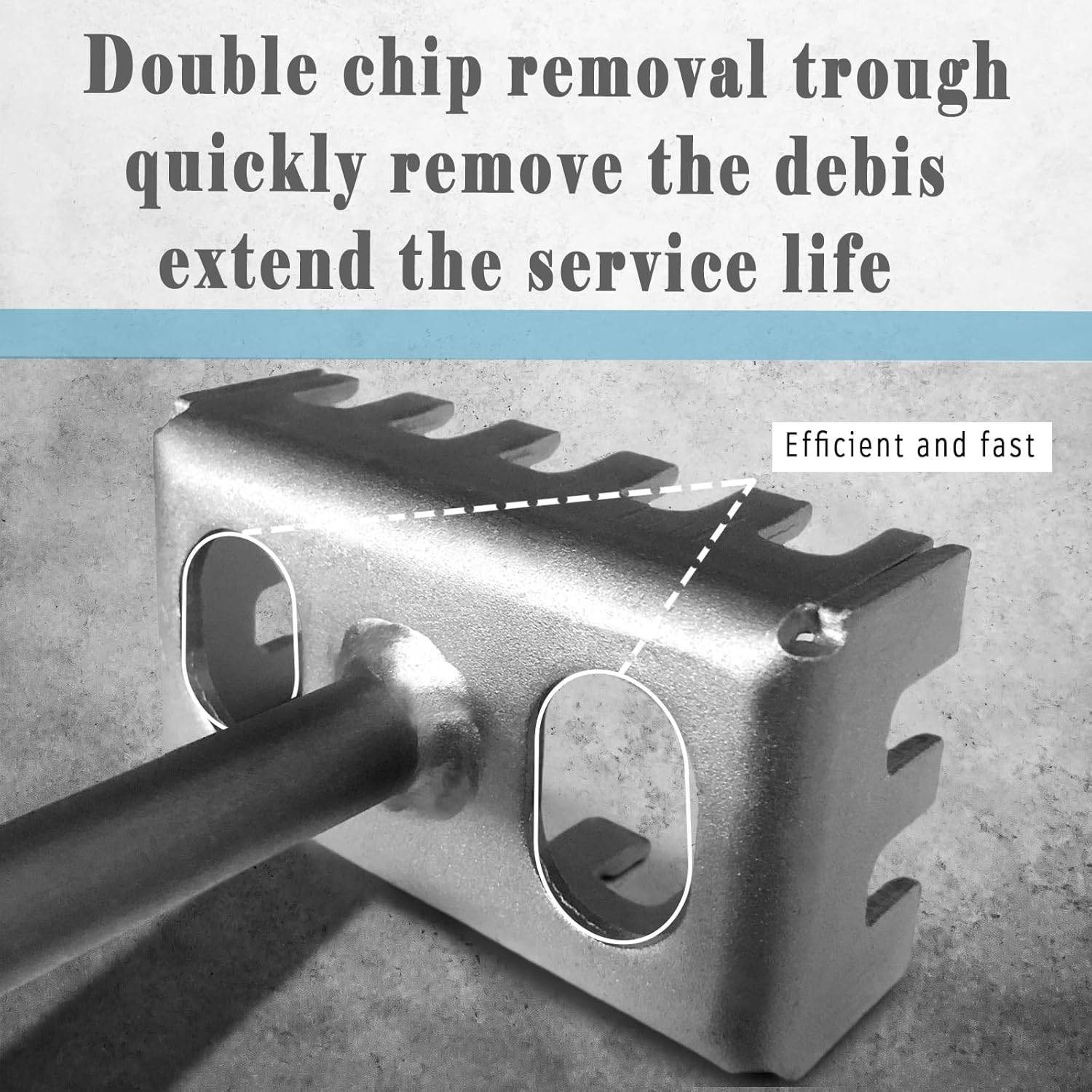 • Canale duble de evacuare a resturilor – Înlătură imediat praful și bucățile de material, prelungind durata de viață.